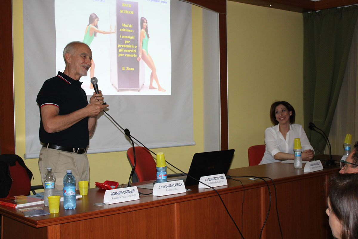 A Giugno del 2019 in occasione del 322° corso di formazione di Back School – Programma Toso rivolto ai laureati in fisioterapia e scienze motorie organizzato a Lavello, il professor Benedetto Toso ritorna a parlare di prevenzione del mal di schiena in una Conferenza patrocinata, per la seconda volta, dal Comune di Lavello e da due realtà associative sempre impegnate nel territorio come l’UNITRE Lavello e Rotary Melfi.